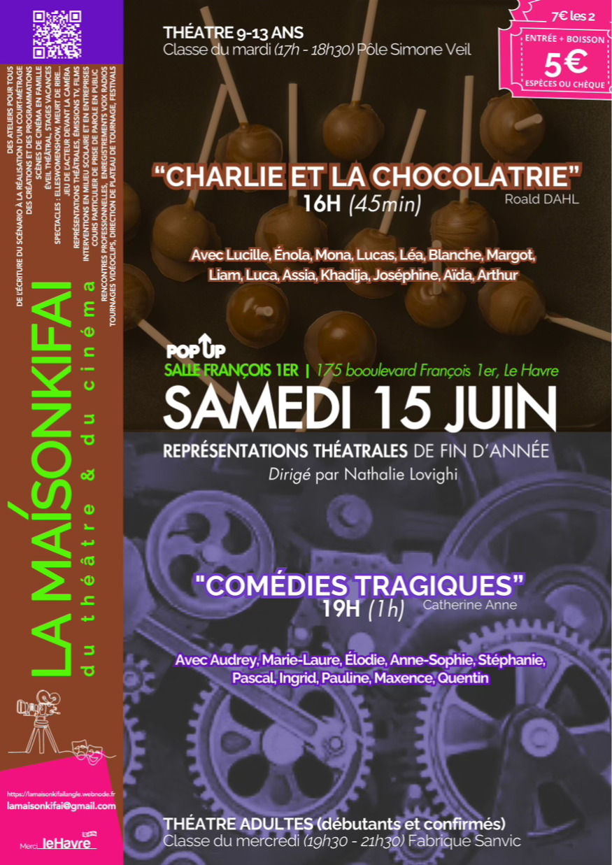 LA MAISONKIFAI (théâtre et cinéma) présente leurs spectacles de fin d’année (atelier enfants et atelier adultes) ainsi que la projection de sa classe d’acting « jeu de l’acteur devant lacaméra » et l’atelier « de l’écriture à la réalisation d’un court-métrage ».